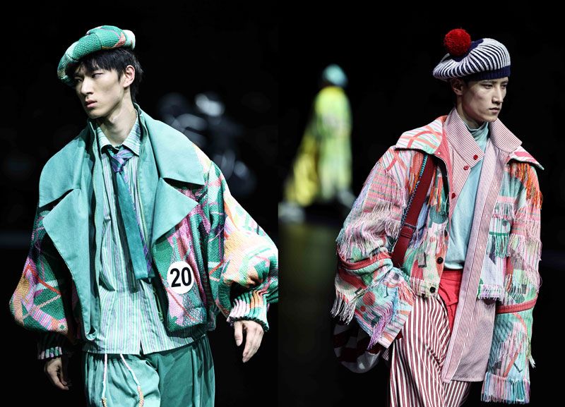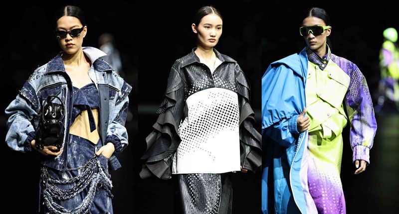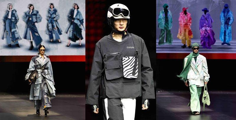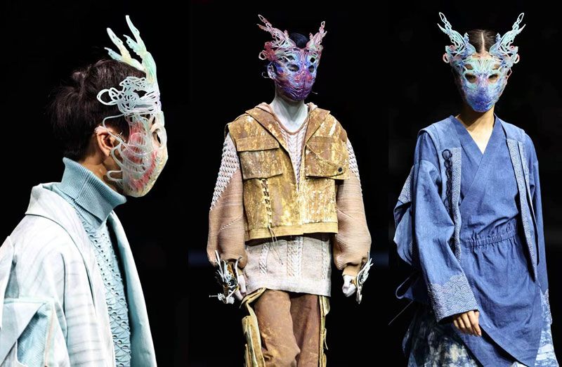 19组来自全国各地(含港澳地区)的青年设计师依次登场,以多元视角诠释大赛主题。运用天然染料编织幻彩纹理,与针织面料形成巧妙的碰撞,讲述宇宙星河中连接现实与未来的载体,或是融合茶染、热转印、植物拓印等工艺,展现新世代设计师对传统文化的思考,又或是以复古磁带为灵感来源,将声波轨迹化作立体绗缝,展现一衣多穿的创新思路……作品体现了青年设计师的先锋性和实验性,展现出Z世代设计师对人、社会与自然的敏锐观察和自主创新的开发能力,以及在剪裁工艺上的专业沉淀。为延续赛事高潮,世界街舞冠军肖杰领衔少年舞团登场,一段热舞吸引机器人前来“Battle”,人与机器竞舞的诙谐画面瞬间点燃舞台。