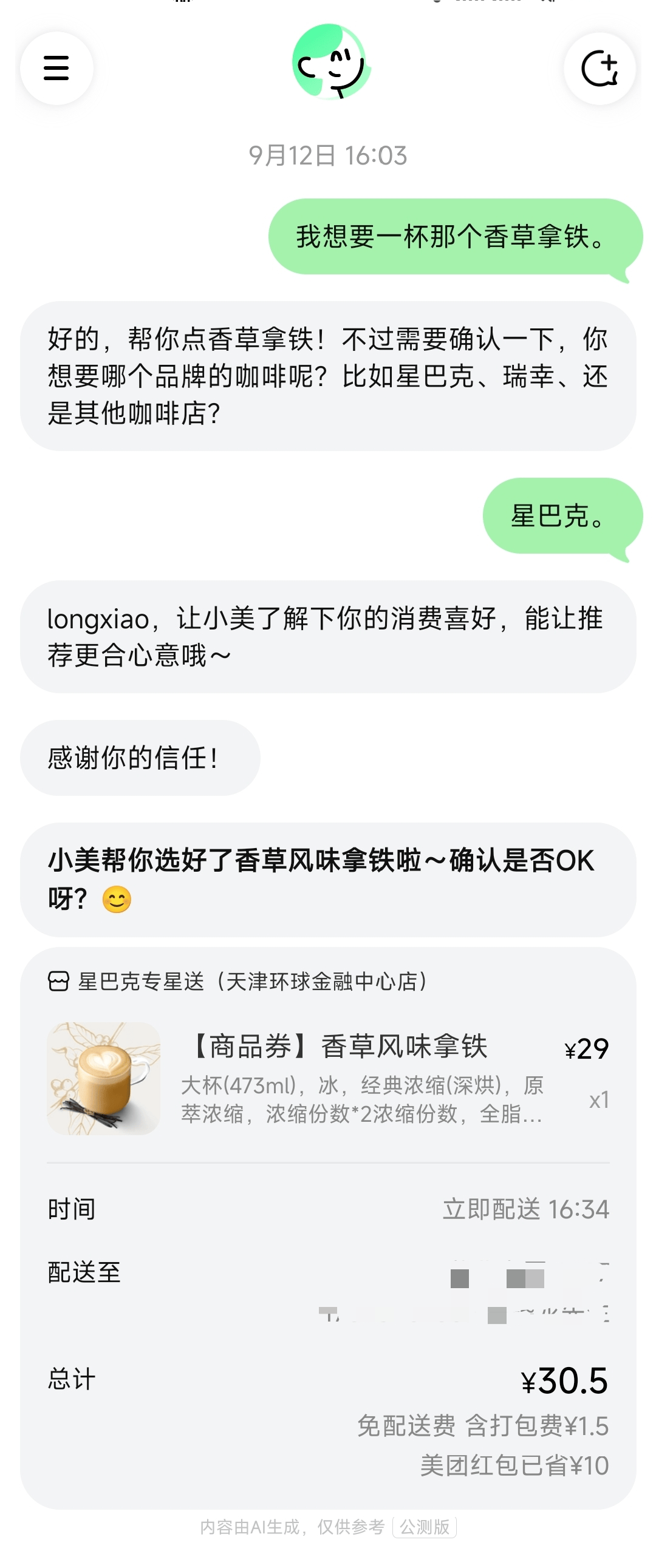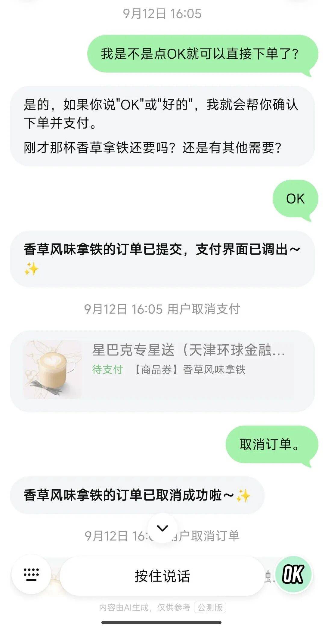 比如AI蓝媒汇向“小美”提出点一杯“香草拿铁”的需求,“后者”会进一步询问,具体是什么品牌。