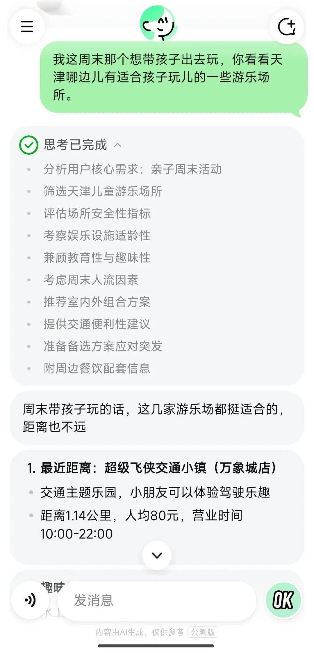 AI蓝媒汇以周末带孩子出去玩为需求导向,让“小美”推荐一些游乐场。后者会进行诸如“分析”、“筛选”、“评估”等一系列思考之后,给出游乐场推荐。具体到每一个游乐场,还会有相应的门票信息、游玩项目介绍,供用户参考。