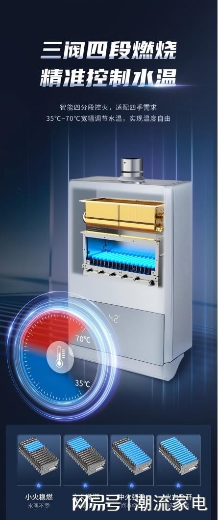 在此基础上,三阀四段燃烧技术进一步细化了温度调节的维度。其智能四分段控火模式(小火稳燃、文火微燃、中火强劲、火力全开)覆盖 35℃-70℃的宽温域,能满足不同用户在不同场景下对水温的多样化需求。尤其在多人连续用水场景中,比如家人先后洗澡,水温不会因水量变化而产生波动,始终保持稳定如一的舒适状态。