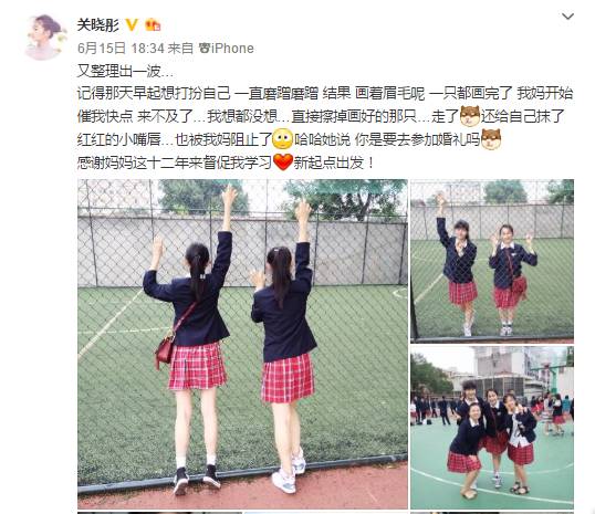 同样是同学之间晒照片,其实之前高中毕业时,关晓彤也曾大大方方晒过自己和同学的照片。