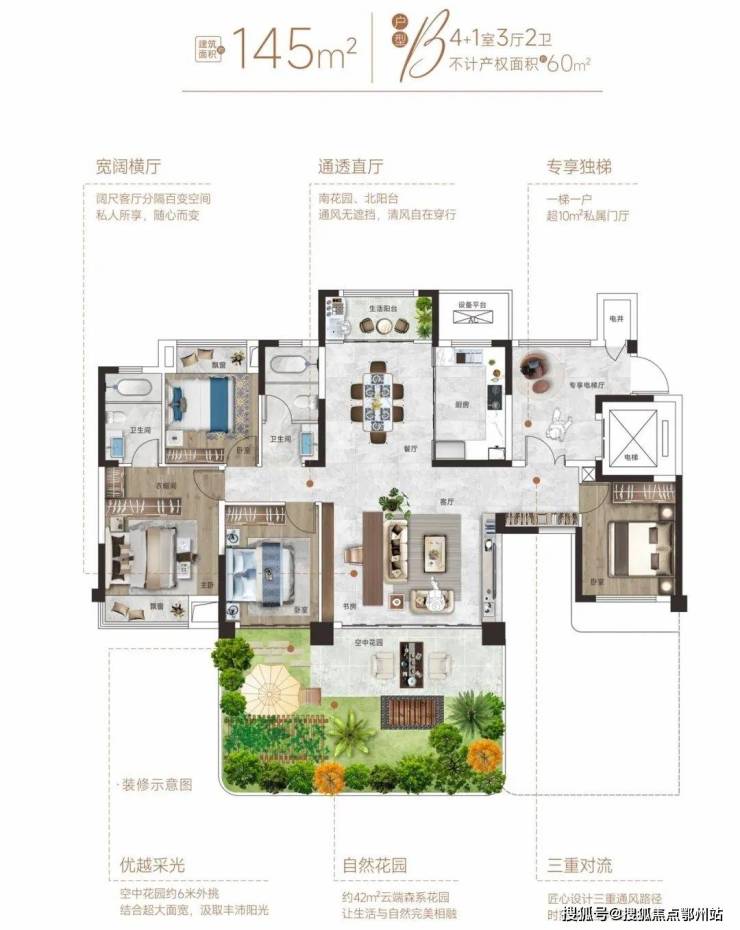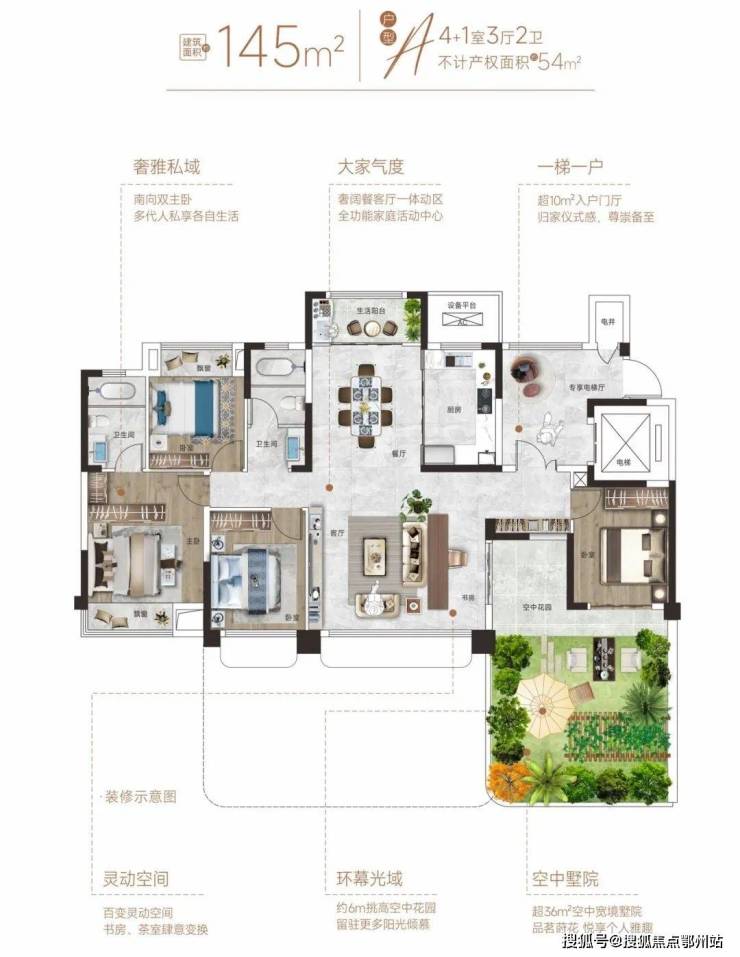 四代住宅赠送率超高,拥有约42㎡超大空中花园,拓展面积可达60㎡,超100%得房率。