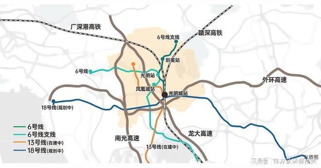 项目周边已形成“双地铁 + 在建地铁 + 高铁”的多维交通体系:现有地铁:6号线号线号线分钟直达南山高新园、后海等核心商务区。在建地铁:13 号线年底通车,串联光明科学城与深圳湾口岸,光明城站作为换乘枢纽将实现地铁、高铁无缝衔接。高速公路:龙大、南光、外环高速环绕,40 分钟可达福田、东莞等区域,满足跨城通勤需求。