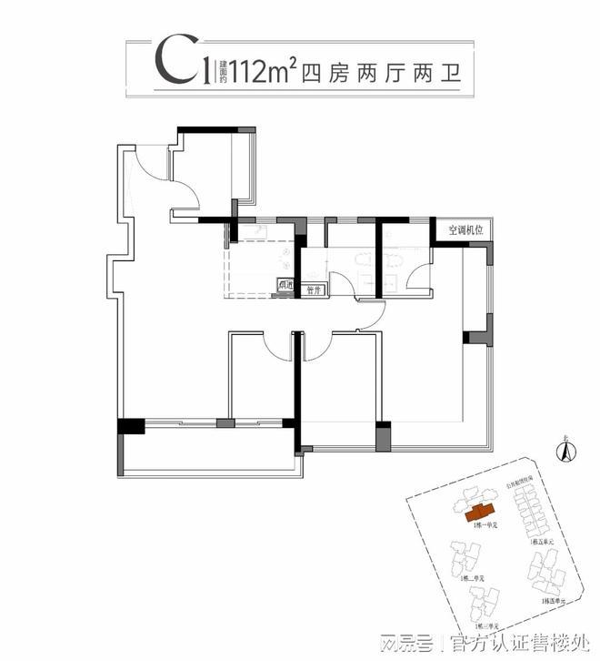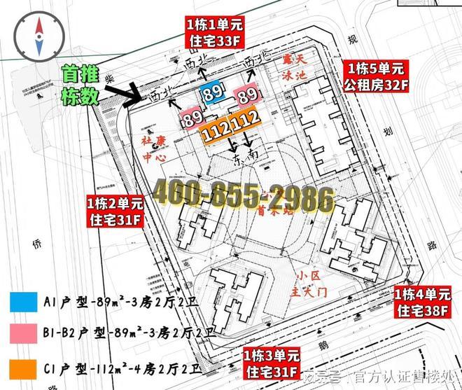 本次首推1栋1单元,共155套房源,面积有89m²的3房2卫,112m²的4房2卫户型,2梯5户设计,新规产品的。