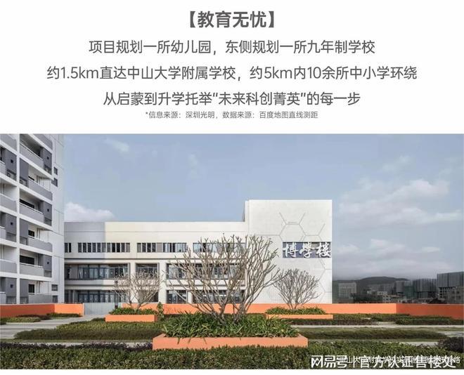 项目西北侧为科学公园北翼(已开放),东南侧毗邻光明欢乐田园,周边环绕约 2000万㎡光明生态廊道,形成“城在园中”的居住体验。人文配套:约1.5公里内规划深圳国际美术馆、科技馆等文化设施,1公里范围内有光明文化艺术中心,满足艺术休闲需求。