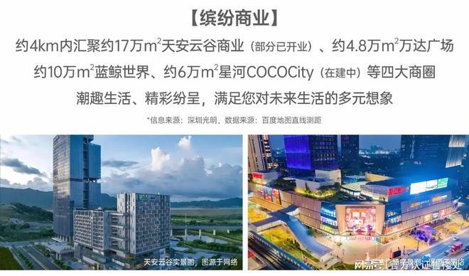 项目自带约 3500㎡商业街区,满足日常消费需求。区域商业集群:星河 COCO City:距项目约2.6公里,2025年底开业,招商引入星巴克、盒马鲜生、寰映 IMAX 影城等180个品牌,打造首店经济聚集地。光明中心区商圈:4公里范围内覆盖万达广场(4.5万㎡)、蓝鲸世界(13万㎡)等,形成超30万㎡商业集群。